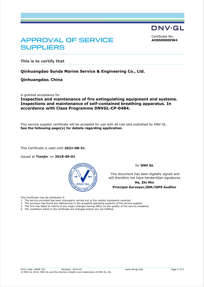 秦皇島順達船務有限公司位于美麗的海濱城市、中國北方著名的能源輸出大港--秦皇島。公司從事于船舶修理、物料供應、水下檢測、船體測厚、消防救生設備及救生艇檢驗、電氣自動化修理等服務。 公司自1997年成立至今,先后為國內外船東修理、檢驗各類船舶萬余艘,積累了豐富的施工經驗。公司現有場地100余畝,員工30余人,以及工程用車若干臺。我們公司一直本著嚴以律己、真誠待人、精益求精、信譽至上的經營理念,以優質的服務、專業的施工、合理的收費,得到了國內外船東的廣泛認可,贏得了良好的口碑和信譽。 公司已取得了中國船級社(CCS)、美國船級社(ABS)、日本船級社(NK)、德國船級社(DNV GL)等各個船級社的消防救生和救生艇檢驗資質, ...